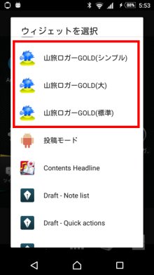 アプリ一覧で「ウィジェット」のタブを選択して,山旅ロガーを選ぶと,