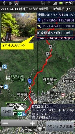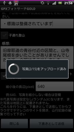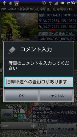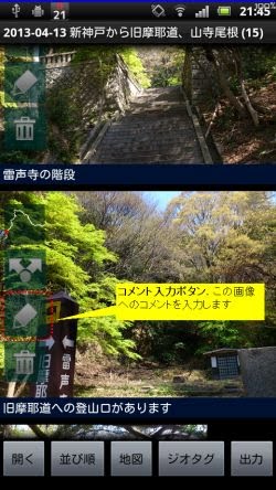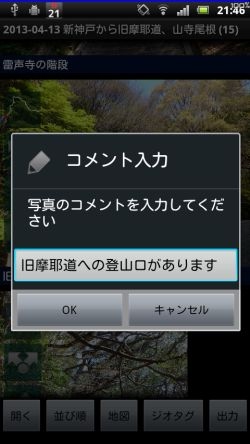 アルバムのGPSログ,写真(コメント込み),その他情報を.ヤマレコに山行記録として投稿できます その使い方を説明します. ※この機能では, ヤマレコWeb API を使用しています ※ ヤマレコ は,登山,ハイキングなどの情報を共有できるサイトです.無料で会員登録できます. なお山行記録の検索には,地図ロイドが対応しています( ヤマレコの山行記録を検索する ) 1.アップしたい山行をGPXフォトサーチで読み込んでおく山旅ロガーから「機能」-「SDから写真を検索」を使う,DropboxアプリやファイルマネージャアプリからGPXファイルを送信するなどして,その山行の記録データをGPXフォトサーチで読み込んで下さい.検索された写真を,ヤマレコに投稿できます. (写真がない場合でも,GPXフォトサーチから写真無しとして下書き投稿し,あとでパソコンから写真を追加アップすることはできます) 2.写真にコメントを入れる必須ではありませんが,写真にコメントを入れると山行記録が充実するでしょう.そのためには,GPXフォトサーチであらかじめ写真にコメントを入れておきます. 入れるには,写真を表示しているメイン画面でコメント入力ボタンを使うか,