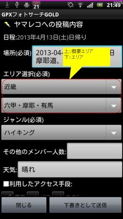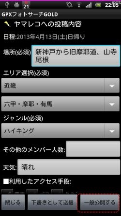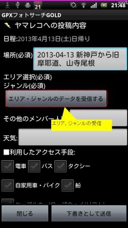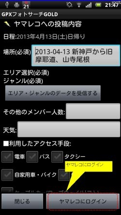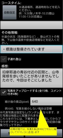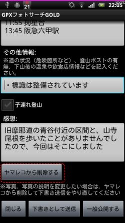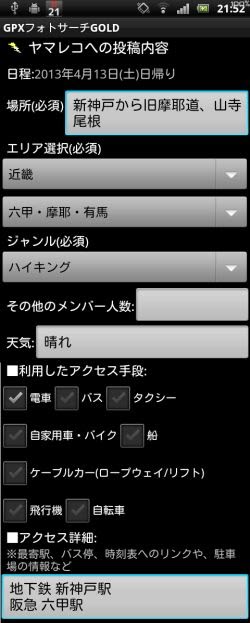 すると,ヤマレコへの投稿画面が表示されます. 日程はトラックログの開始日,終了日で自動設定され,場所はアルバム名が入っています.
