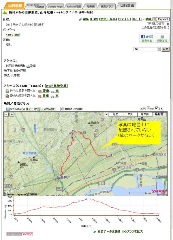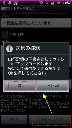 また,ルートから100m以内にある地名は通ったという扱いになるので,実際には通っていない場所がでる場合があります. このように,抜けてしまう場合や,逆に余分なものが出力される場合があるため,内容は自分で確認された方が良いと思います. (E) ヤマレコへのアップロードヤマレコにアップロードしてみます.全部の項目を入力する必要はありません.右下の「下書きとして送信」ボタンを押して下さい.