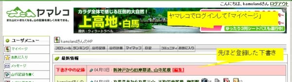アップロードが成功したので,ヤマレコのサイトをパソコンで開いて見てみます. ブラウザでヤマレコを開いて,自分の会員IDでログインして「マイページ」を見ます.