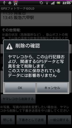 (F) ヤマレコからの削除アップロードした記録をヤマレコから削除できます.「ヤマレコから削除する」ボタンを使って下さい.