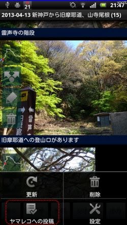 で入力して下さい.このコメントのデータはGPXフォトサーチ内部で保存されます.写真の画像ファイルに含まれるわけではありません. 3.ヤマレコへの投稿機能を使うメニューボタン,新しい機種なら右上の「:」ボタンを押して,「ヤマレコへの投稿」を選んで下さい.