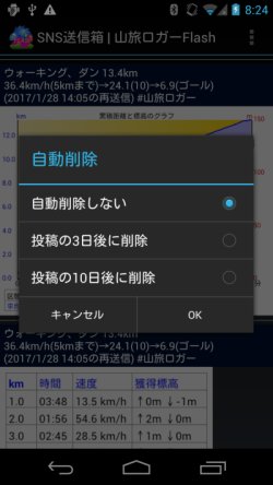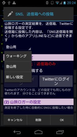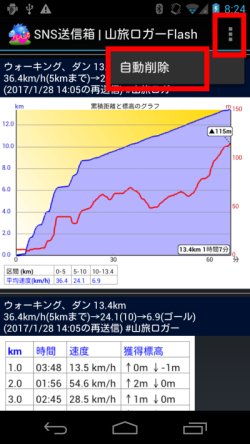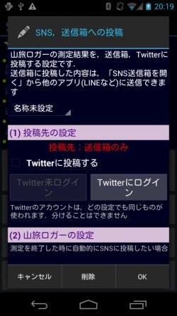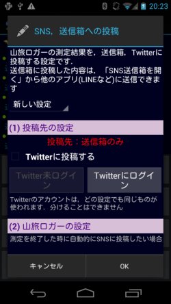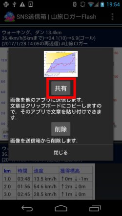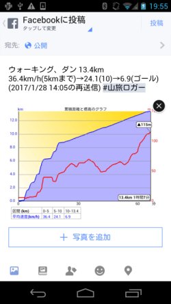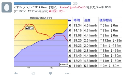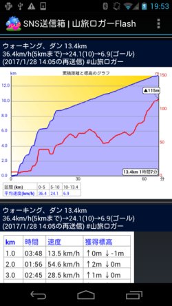 を変更できます.ご利用には山旅ロガーのバージョン4.11以上が必要です.(無料版,GOLDのどちらでも構いません) 山旅ロガーFlash[Google Play] ホーム > アプリケーション > 旅行 > 山旅ロガーFlash インターネットの通信を使いますので,電波が入っているエリアでしか使えません. ◆用途★SNSでグラフと地図を手軽に共有Bluesky,Mastodonに,測定結果の合計距離と,距離と標高のグラフ,経路の地図を投稿できます.