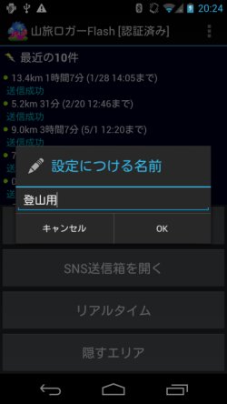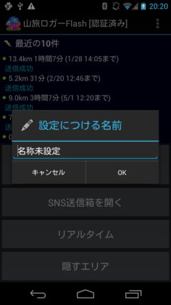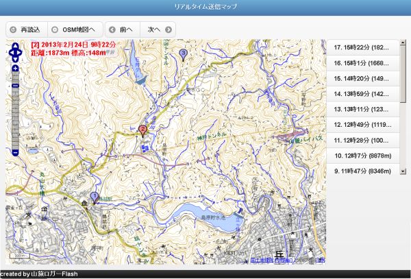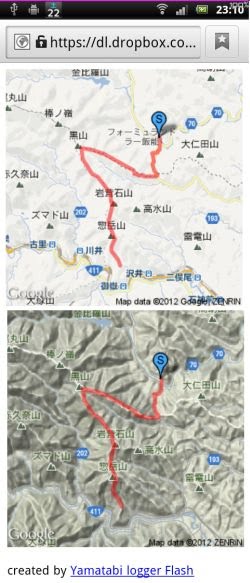 ※Android 4.2以上の機種の場合は,Googleの制限により機内モードを自動解除できません. そのため,リアルタイム送信を使う場合は,機内モードにしないようにして下さい. 節電の点では良くないのですが,仕方ない状況です サンプルのマップ1 (丸見えモードオフ) ※このURLをブラウザで開いて,パスワードは「0000」を入力して下さい. サンプルの詳しい説明 このサンプルは,2013/3/16に谷上駅から炭ヶ谷~シュラインロード~有馬口駅へ歩いたときに実際に送信したものです.送信間隔10分の設定で, 機内モード にしていました. 山旅ロガーFlashのリアルタイム送信設定で「通信を強制的に有効にする」にして,送信時には自動的に機内モードを解除するようにしていました.(これをやらないと,機内モードだと送信できません)