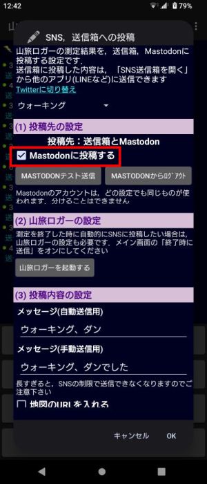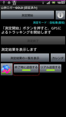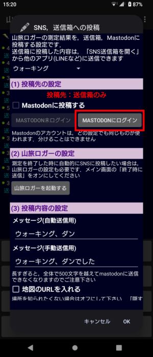 (B) 他のSNSを使う場合は,「Mastodonに投稿する」はオフのままで良いです.送信箱に投稿できればよいです. (1) 山旅ロガーで測定終了したときに,自動的に投稿するようにする山旅ロガーで設定してください.(最初に書きましたが,バージョン4.11以上の山旅ロガーが必要です)山旅ロガーのメイン画面に,山旅ロガーFlashのアイコンと並んだ「終了時に送信」のボタンがあります.