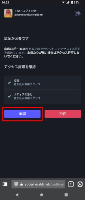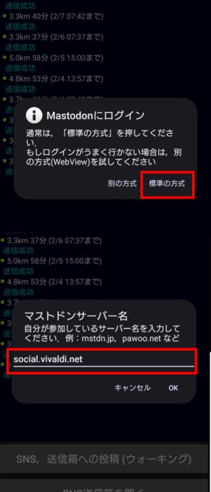 ・準備 (Mastodon,送信箱への投稿)(A) Mastodonに投稿する場合は,まず最初に,投稿を行うMastodonのアカウントにログインしてください.「SNS,送信箱への投稿」を押すと表示される画面の「Mastodonにログイン」ボタンを押して,行ってください. Mastodonへの自動送信を使わず,他のSNSに送信する場合は,Mastodonログインは不要です. (A) Mastodonに送信する場合は,Mastodonへログインしてください. スクショを添付しますが,自分がアカウントを持っているマストドンサーバを入力して,ログイン,アクセス許可を行います.