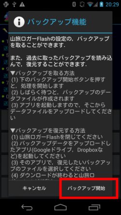 隠すエリアを何も設定していない場合は,山旅ロガーで測定した始点(S)から,終点(G)までの経路を表示します. 隠すエリアの話は,あとで出てきます. ◆機種変更,バックアップ他のアプリ(地図ロイド,山旅ロガー)と同じように,バックアップ機能があります.