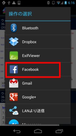 投稿したい画像でタップすると子画面が出ますので,「共有」を押すと, 画像を送信するアプリを選べます. 例えばFacebookを選ぶと, 画像を読み込んだ状態でFacebookアプリが起動します.