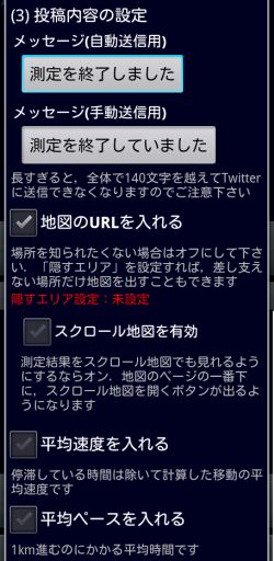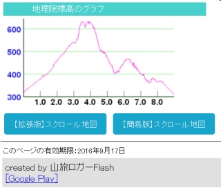 スクロール地図をオンにすると,地図のURLを開いた画面の下に「スクロール地図を表示」というボタンが出るようになります. このボタンを押すと,地形図またはOpenStreetMapのマップが表示されます. 実際の例は,これを見て下さい. 平均速度(km/h)は,停滞している時間(速度が200m/hより小さい箇所を停滞と判定)を除いた速度で,平均ペースは,その速度から計算した1km進むための所要時間です. 測定結果全体を,距離によって2~4つの区間に分けて,それぞれの区間での平均値を出力します. ・平均速度の例 3.0km/h(4kmまで)→2.3(8)→2.7(12)→3.0(ゴール) スタートから4km地点までは,3.0km/h