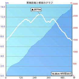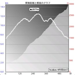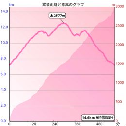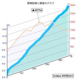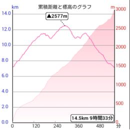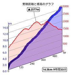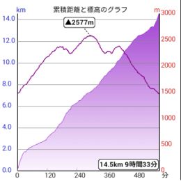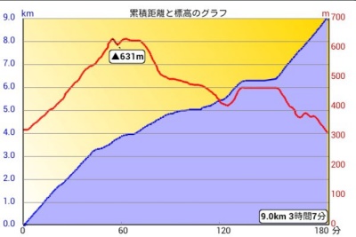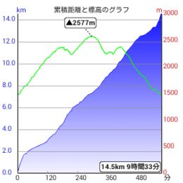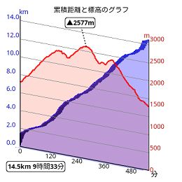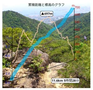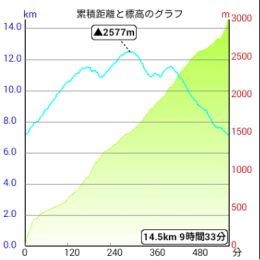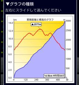 グラフには,右下に合計距離と合計時間が出て,最大標高点に,▲と最大標高値 が表示されます.