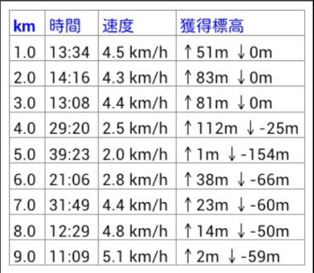 スプリットテーブルには,区間ごとの速度や獲得標高(上り,下り)などが出ます.