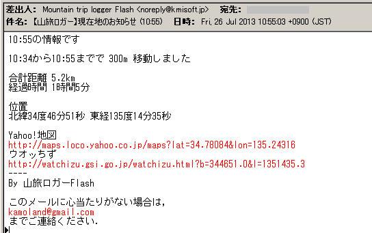 ★家族を安心させるために現在地を自動的に連絡設定した時間ごとに,山旅ロガーで取得した現在地を送信し,他の人が地図上で見ることができます.地図は,URLとパスワードを知っている人だけが,PC,スマホのブラウザで開くことができます.