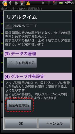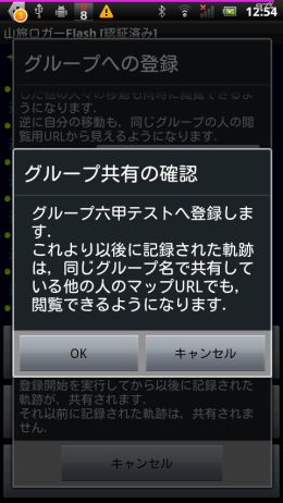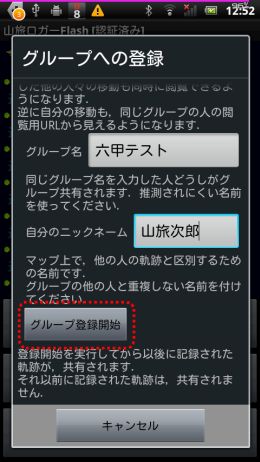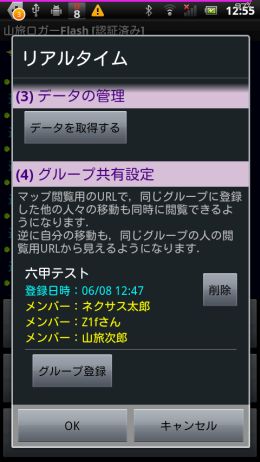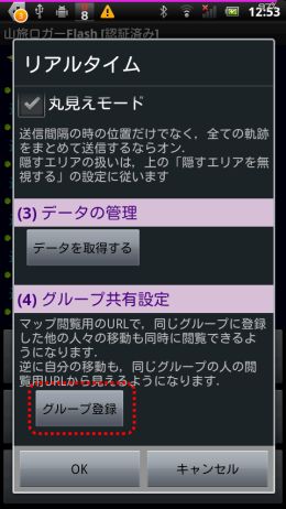 知り合いの人全員の移動を,一度に確認するような使い方ができます. 使い方(1) グループ名を決める使用するグループ名を決めてください.(20文字まで).同じグループ名を設定した人どうしがグループ共有されますので, 第三者から推測できないような名前にしてください. このグループ名を,山旅ロガーFlashで位置を送信する人全員に教えてください. (2) 全員に,そのグループ名を登録してもらいます一緒に確認できるようにしたい人全員に,各人の山旅ロガーFlashにそのグループ名を登録してもらいます.起動して「リアルタイム」から (4)グループ共有設定 です.