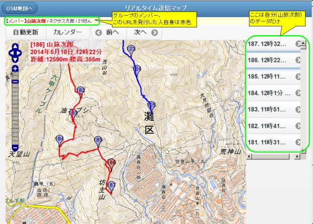 自分は「山旅次郎」というニックネームで登録しましたが, 既に同じグループに2名登録されていることがわかります. (3) リアルタイム送信をオンにして,山旅ロガーの測定を開始する通常のリアルタイム送信を使うときと同じように,山旅ロガーで「リアル送信」をオンにして測定開始してください.(4) マップで閲覧するURLをブラウザで開いてマップを閲覧します.すると,そのURLを発行した人自身の移動データだけでなく,グループ内の他の人のデータもマップに出ます.