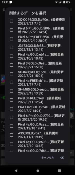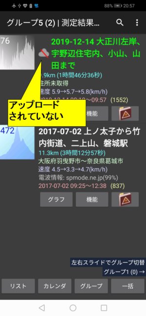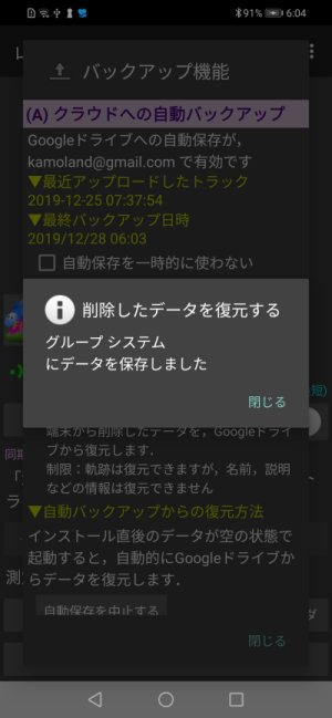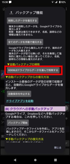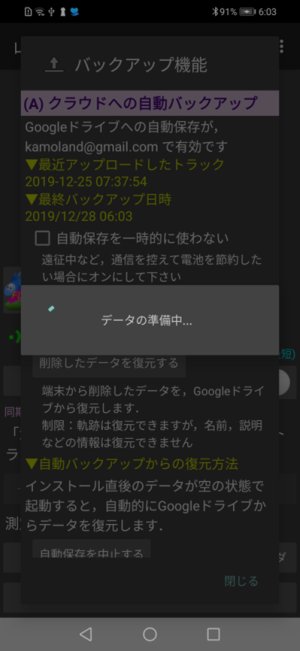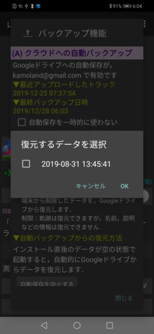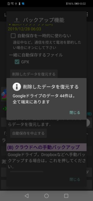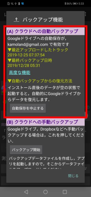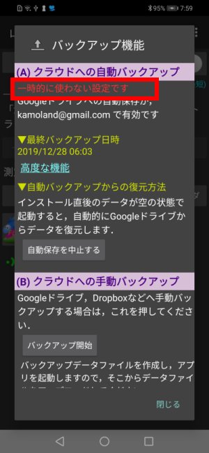 測定終了時に電波圏外だった,一時的に無効になっていた(高度な機能 後述)などで,Googleドライブにアップロードされていない記録は,