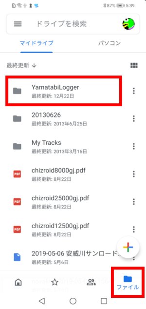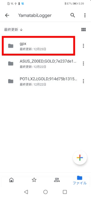 ドライブ内では,既に説明した「YamatabiLogger」フォルダの下に「gpx」フォルダが作られて,