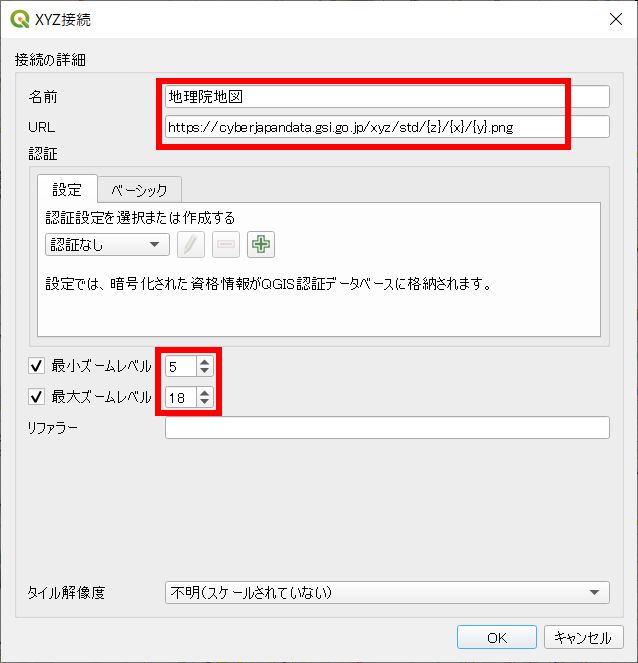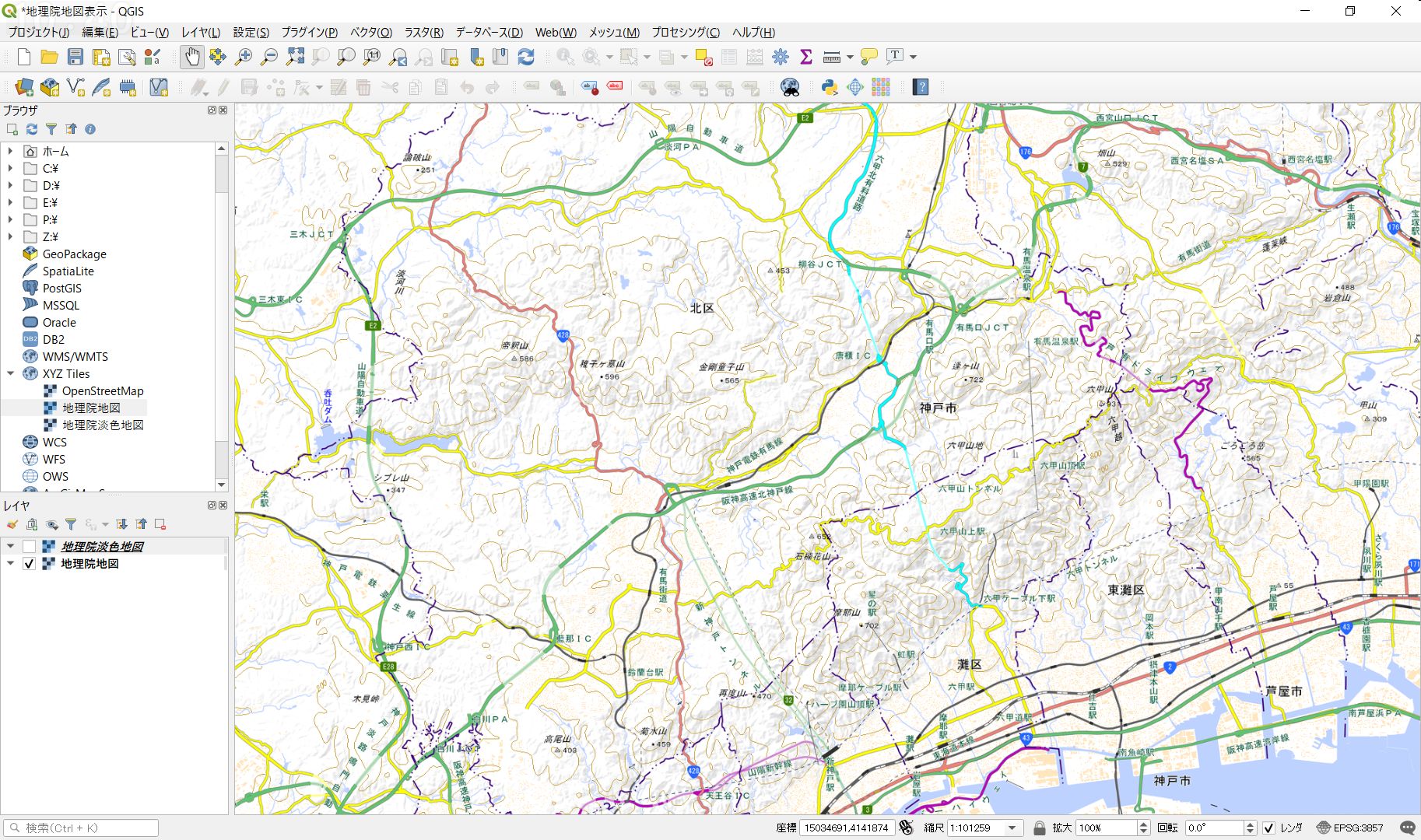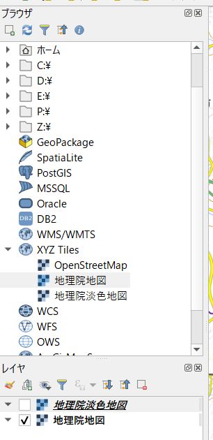 今回は,地理院標準地図を使うため,「XYZ Tiles」で地理院地図のデータを登録し, それをレイヤに追加して表示しています. 地理院地図のデータは,国土地理院の 地理院タイル一覧 にあります.