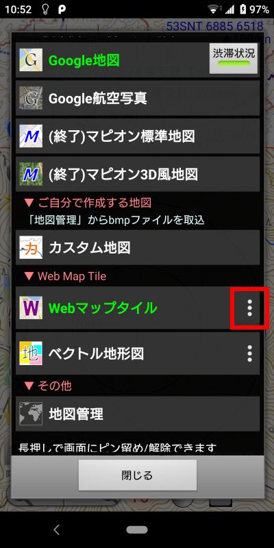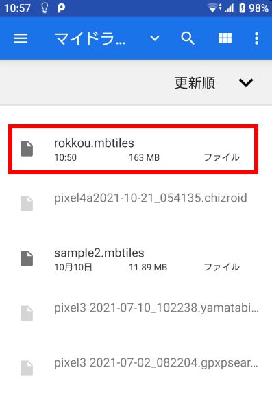今回は,この「rokkou.mbtiles」を,Googleドライブにアップしました. しかしそうではなく,直接USB接続でスマホ本体にコピーしたり,スマホに差しているSDカードにコピーしても構いません. 地図ロイドでmbtilesファイルを取り込むここからは,地図ロイドでの操作になります.MENU-「地図を選択」 で「Webマップタイル」の3点ボタンを押すと,
