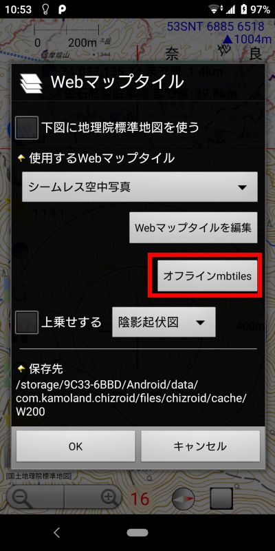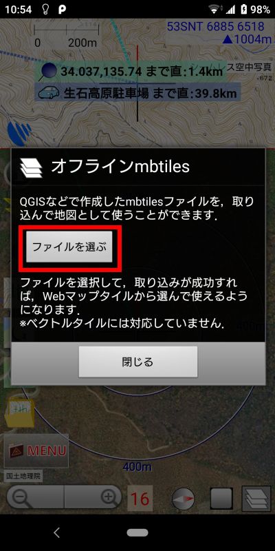 Webマップタイルの設定画面が出ます.ここで「オフラインmbtiles」ボタンを押すと, mbtilesの設定画面が出ます. 「ファイルを選ぶ」ボタンを押して,取り込むmbtilesファイルを選択します.