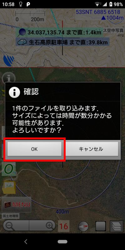その他補足バックアップ機能地図ロイドのバックアップ機能(MENU-バックアップ機能)では,mbtilesデータはバックアップされません.これはカスタム地図と同じですが,バックアップファイルが巨大になり兼ねないため,そういう仕様にしています. もし機種変更した場合は,新しい機種でmbtilesファイルの取り込みをやり直してください. |