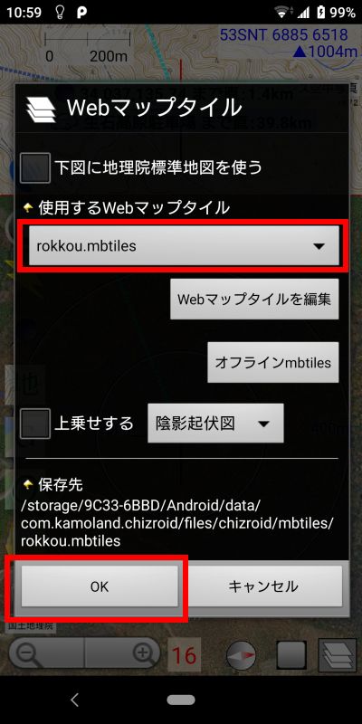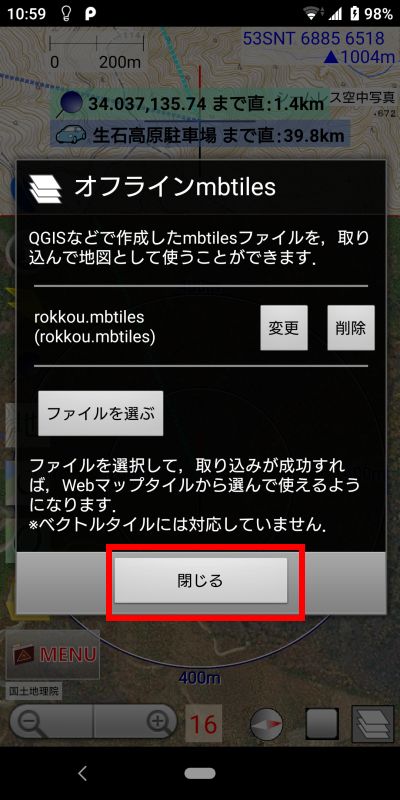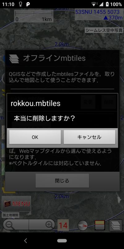 上の画面では地図に表示中なのでグレーアウトされていたのですが,表示していないときは「削除」ボタンを押すことができ, mbtilesファイルを削除できます.