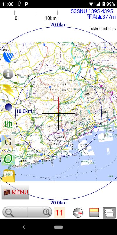 今回,QMetaTilesでは,ズームレベル12~16を指定してmbtilesを出力したのですが, 地図ロイドである程度縮小,拡大できるため,実際にはそれより広いズームレベル範囲が使えます. 上の画像では,レベル11で表示できています. mbtilesファイルの管理変更ボタンを押すと,表示名を変更できます.表示名は,地図画面の右上に表示されるのと,この一覧での並び順に使われます.