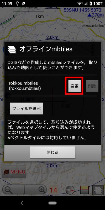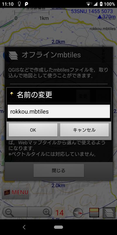取り込みが成功すると,そのマップデータの名前と(ファイル名)が出ます. 名前はmbtilesにメタデータとして含まれていればそれが出て,無い場合はファイル名が使われます.この名前は,変更ボタンでいつでも変更できます.