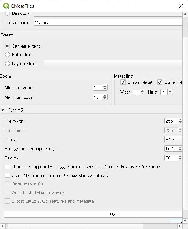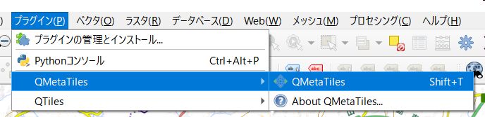 mbtilesの作成ですが,QMetaTilesプラグインというのを使いました.(もっと良い方法があるかも知れません) メニュー-プラグイン からインストールしたあとで実行.