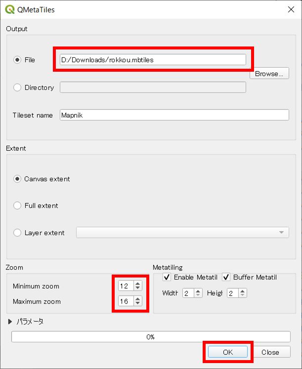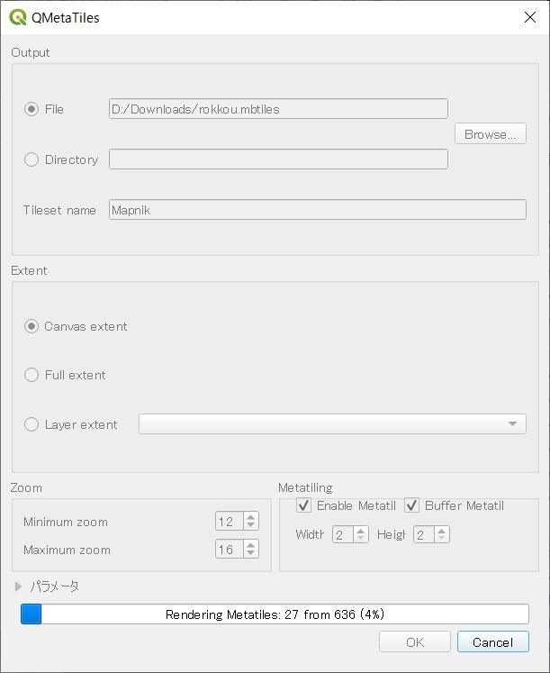 出力先のファイル名と,出力するズームレベル範囲を指定します. ファイル名は,拡張子を .mbtiles として,ズームレベル範囲は通常15~16を使うと思いますので,そのあたりを指定します.