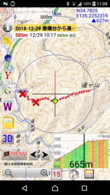地図ロイドバージョン5.19以降では,下図のように出発点からの距離と通過時刻が表示されます.画面の中心に一番近い点の情報です.